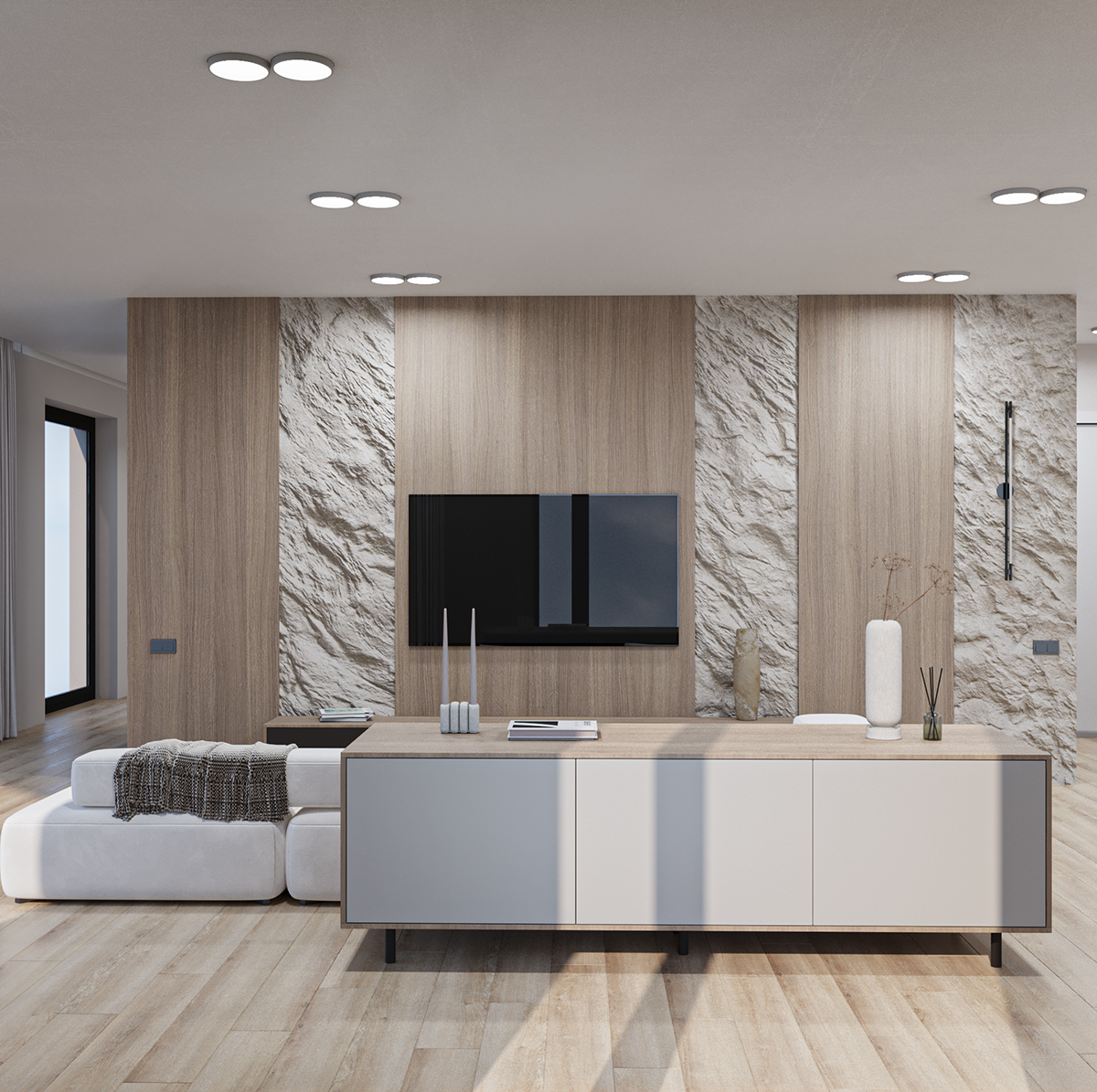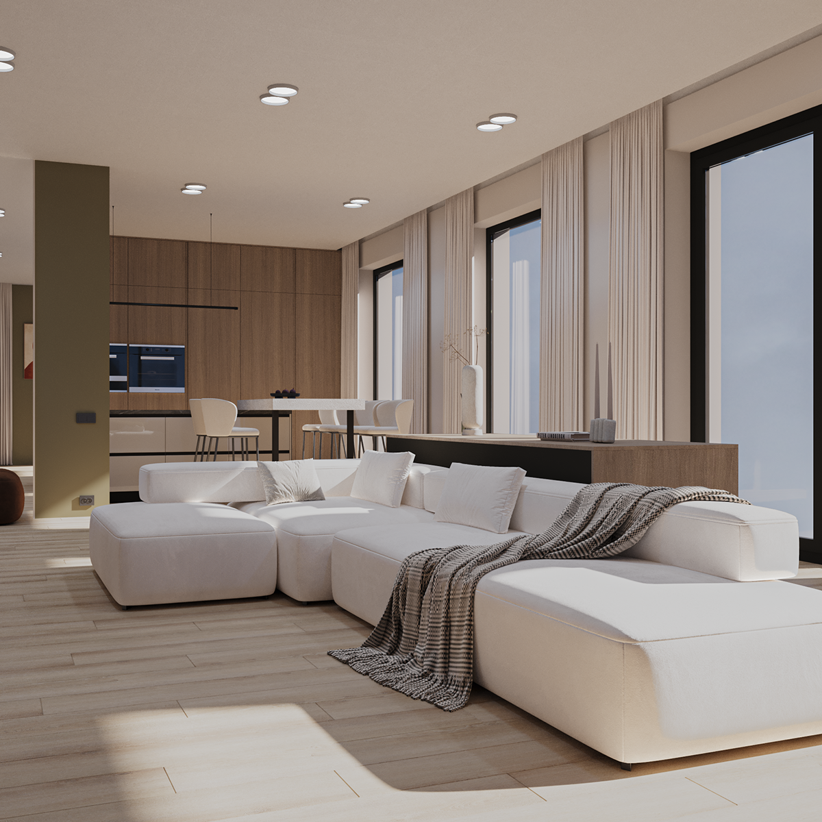 Living area includes a large sectional sofa, coffee