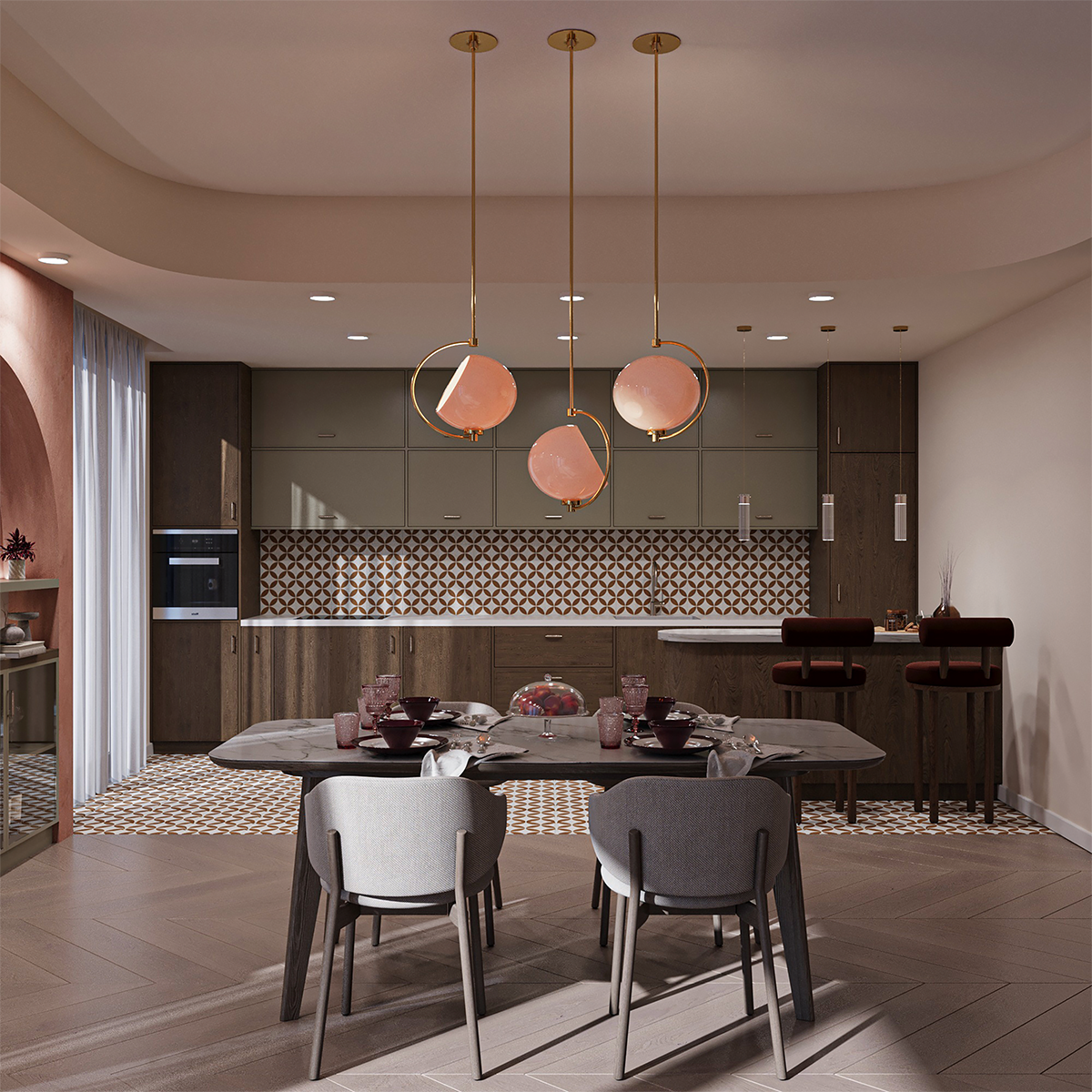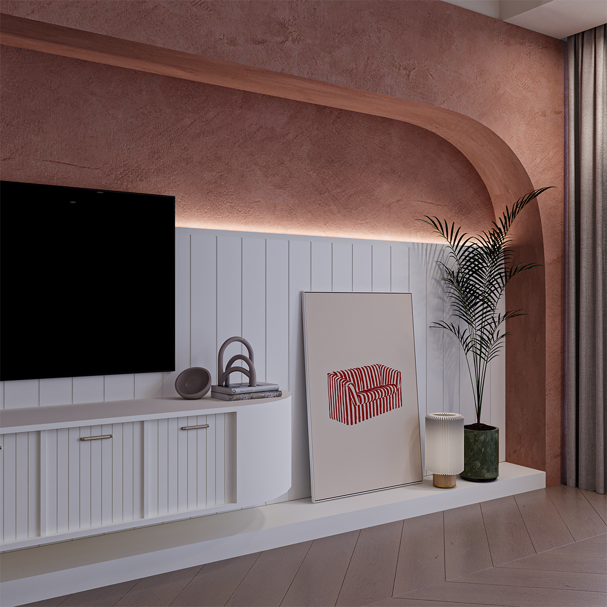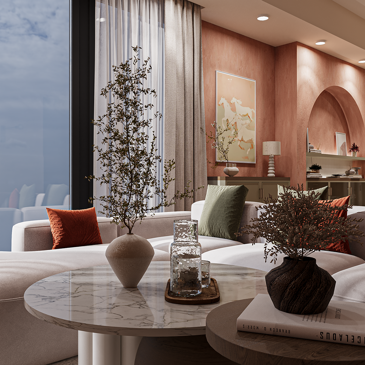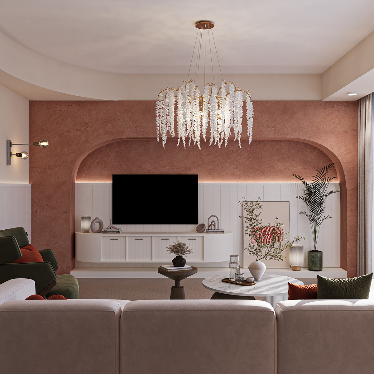This interior design project combines warm terracotta tones, soft natural textures, and elegant golden accents