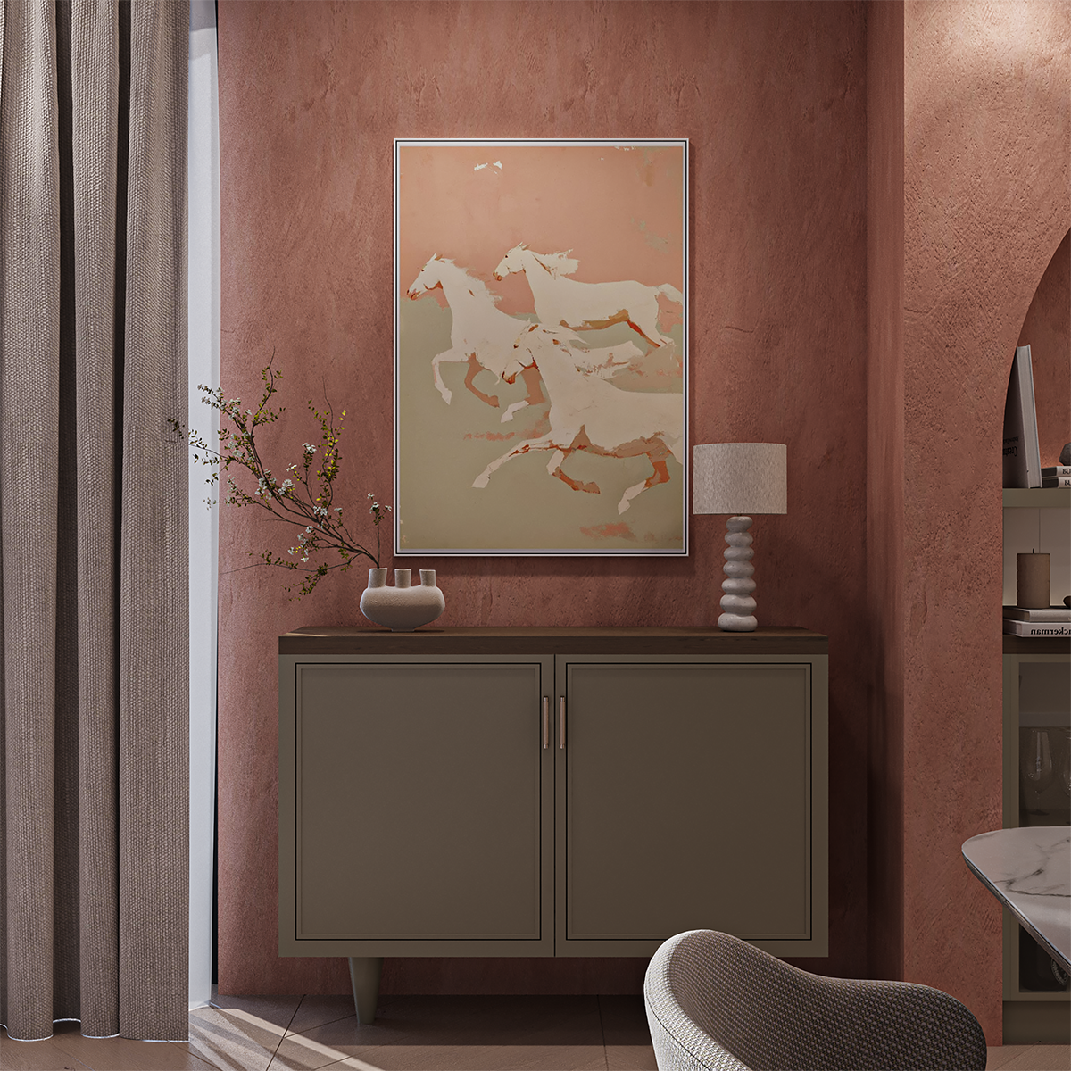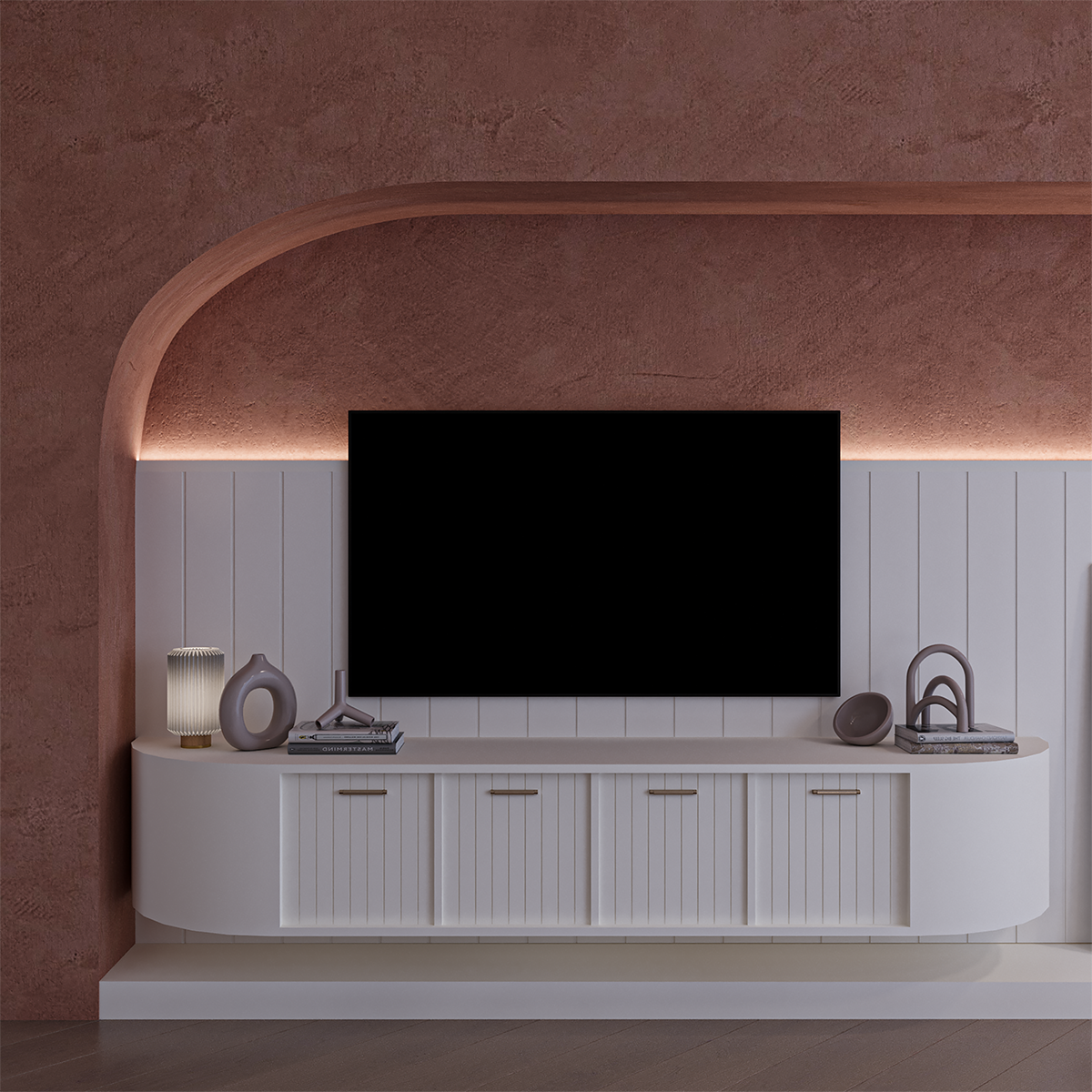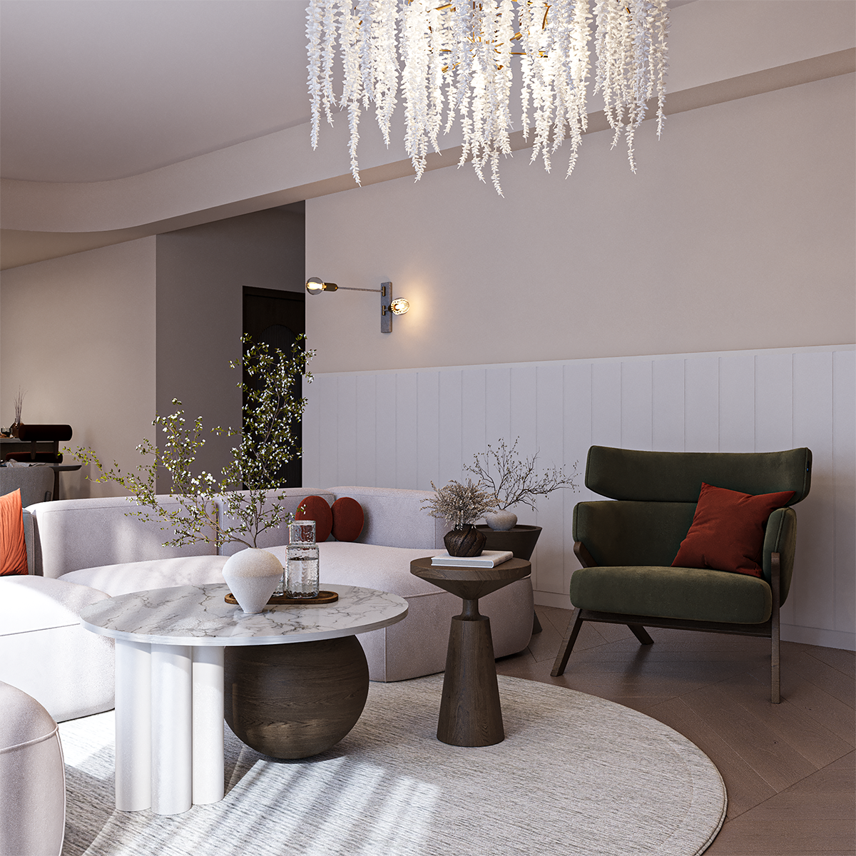This interior design project combines warm terracotta tones, soft natural textures, and elegant golden accents