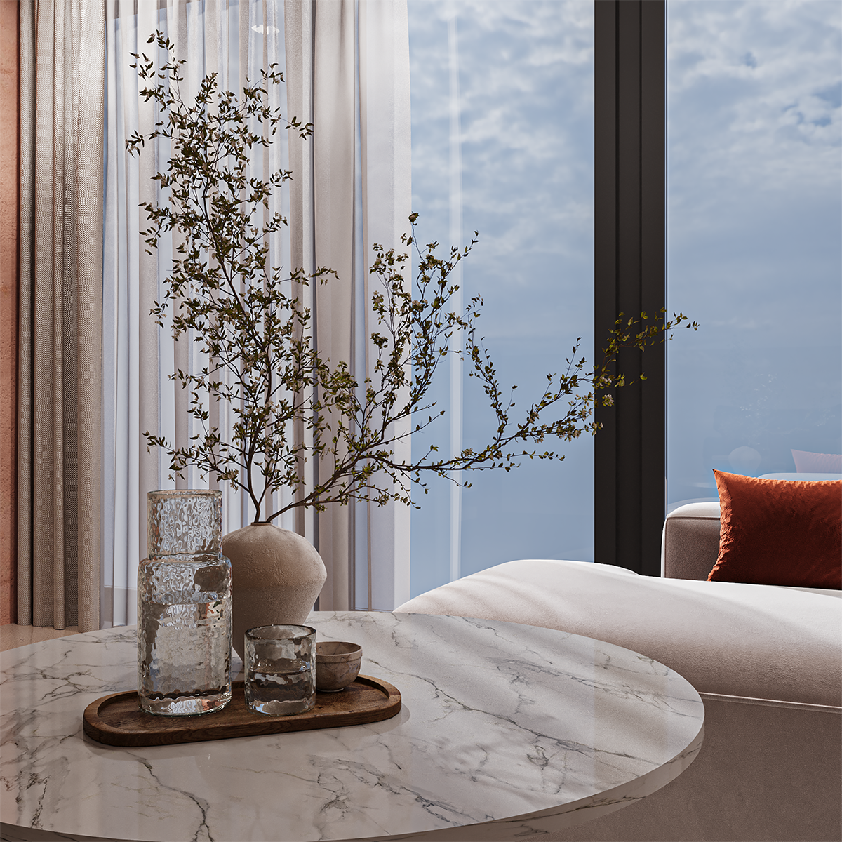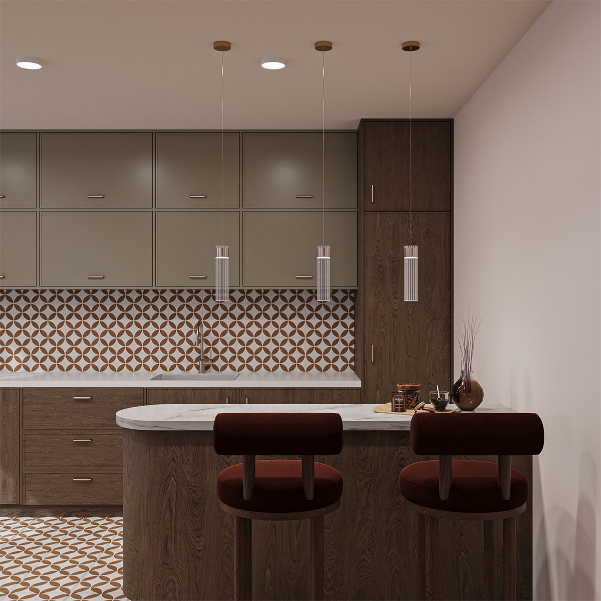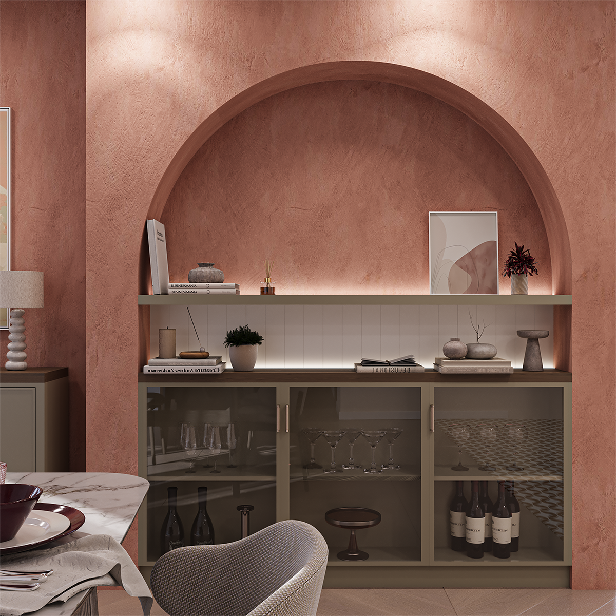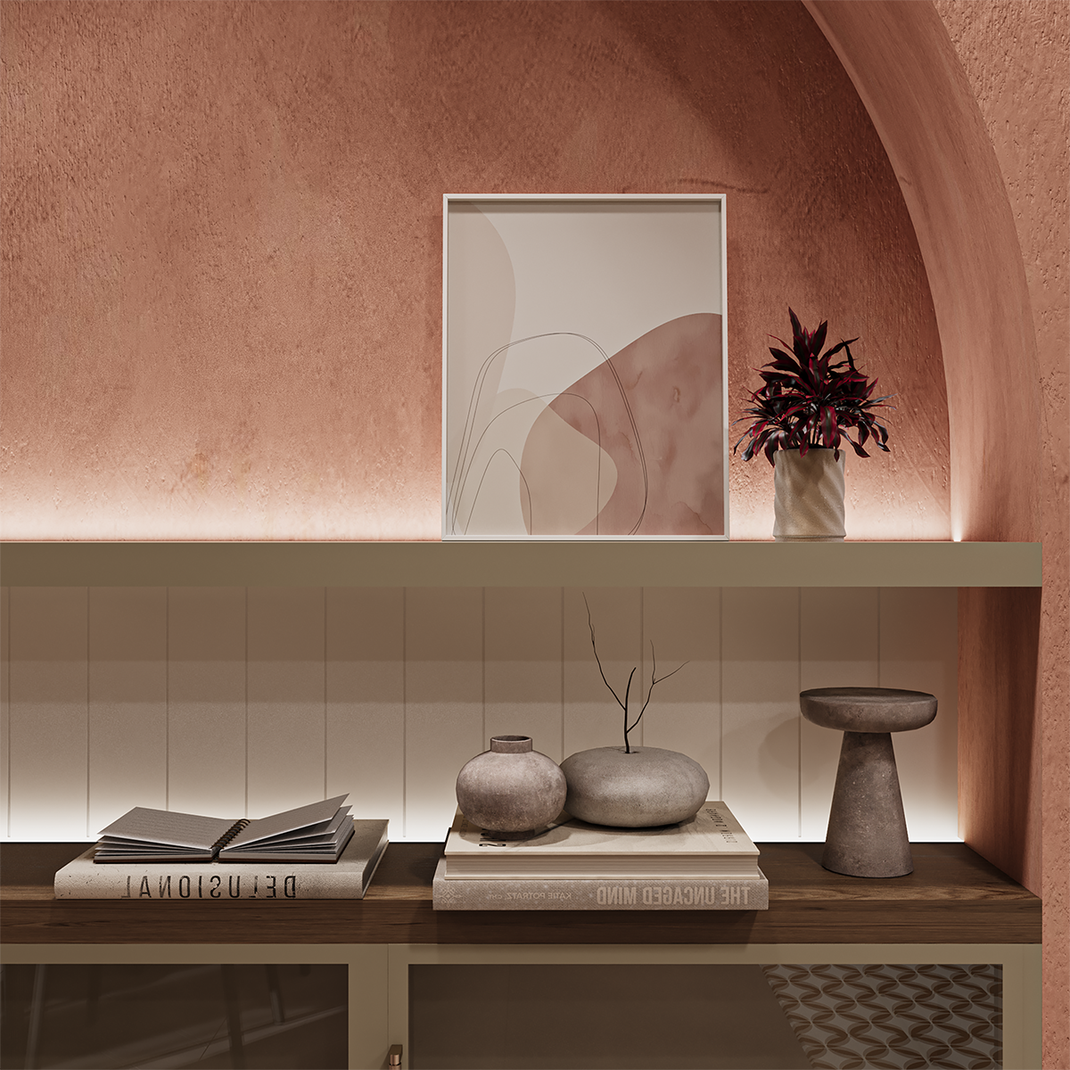 This interior design project combines warm terracotta tones, soft natural textures, and elegant golden accents