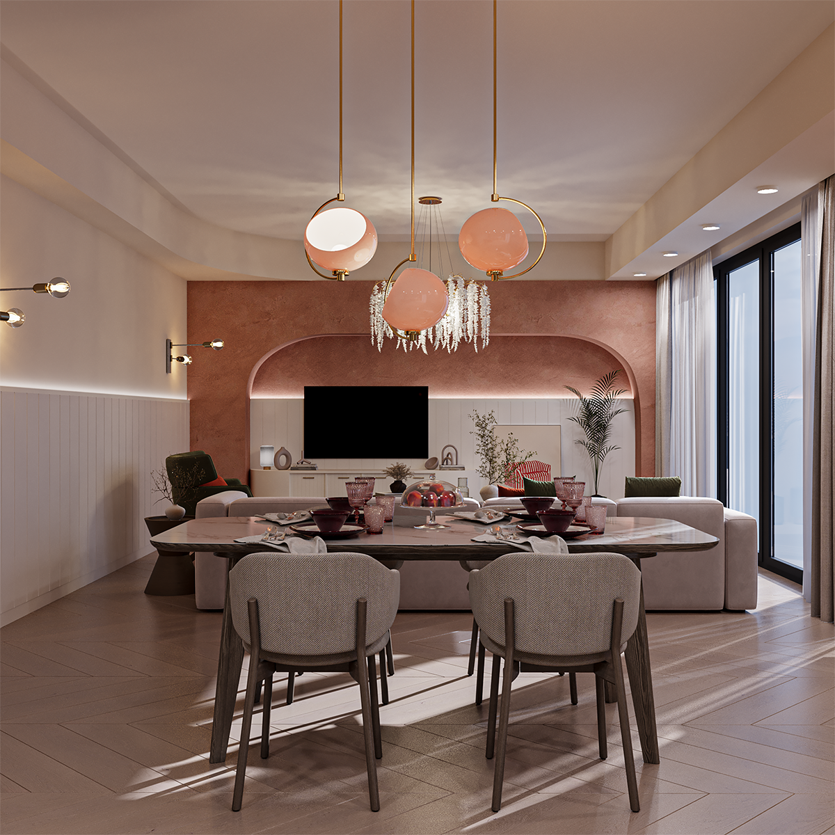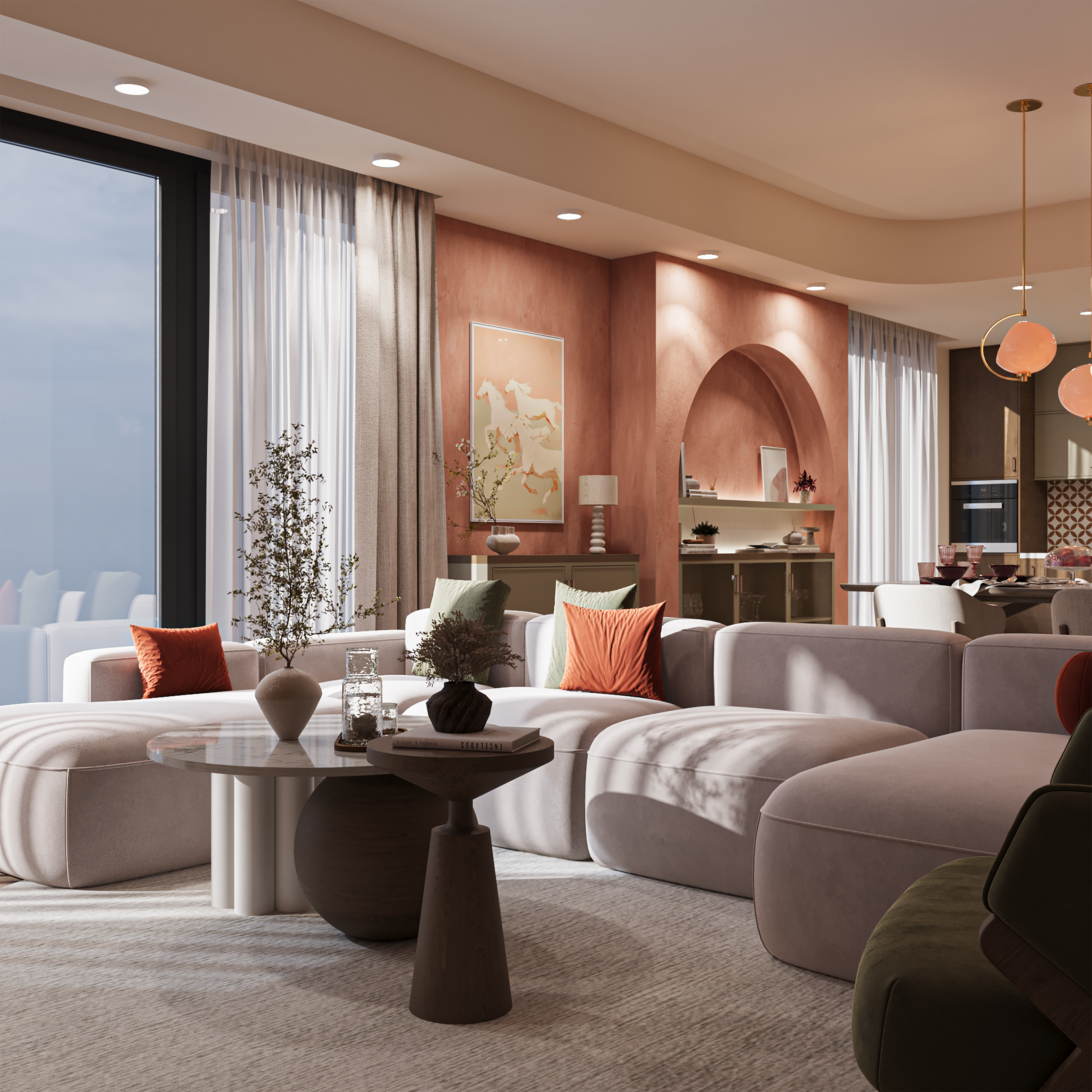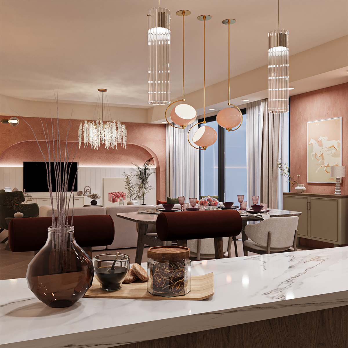 refinement, seamlessly connecting the living, dining, and kitchen areas into one cohesive composition. The